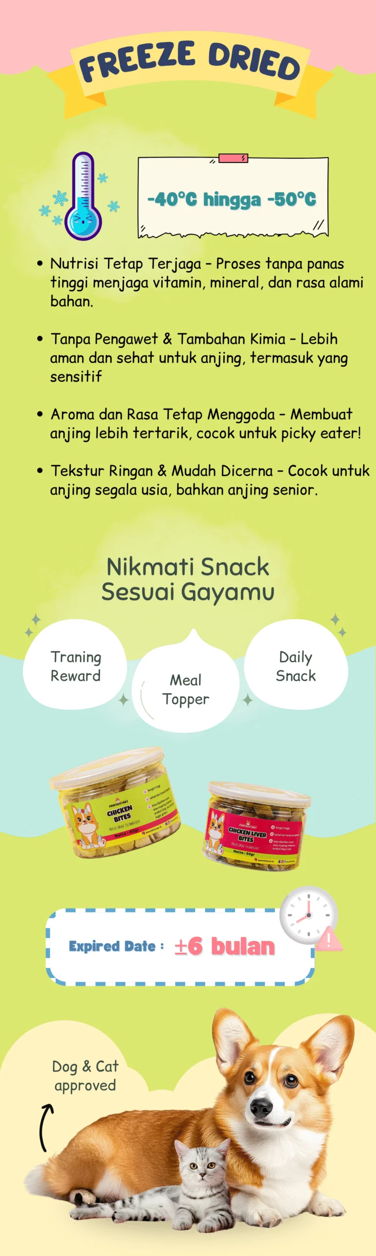 Freeze Dried Duck Liver Bites merupakan sumber vitamin A alami dengan rasa kuat yang disukai anjing. Cocok sebagai reward berkualitas tinggi untuk anjing yang aktif dan cerdas.