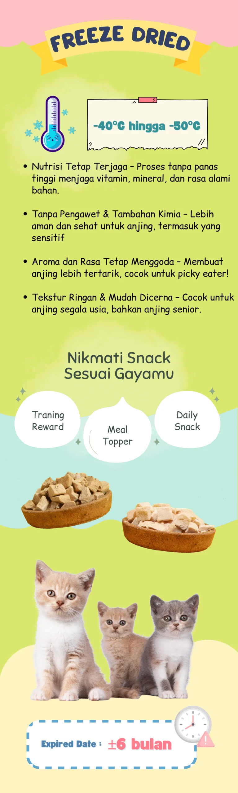 Luna Cat Freeze Dried Chicken Bites adalah camilan kucing yang terbuat dari 100% daging ayam segar tanpa tambahan bahan buatan. Diproses dengan metode freeze-dried untuk menjaga kandungan nutrisi seperti protein tinggi dan vitamin B kompleks, camilan ini mendukung pertumbuhan otot, sistem kekebalan tubuh, serta kesehatan kulit dan bulu. Teksturnya lembut dan mudah dikunyah, cocok untuk kucing dari segala usia. Bebas biji-bijian, pewarna, dan pengawet—ideal sebagai treat sehat harian atau topping makanan utama.