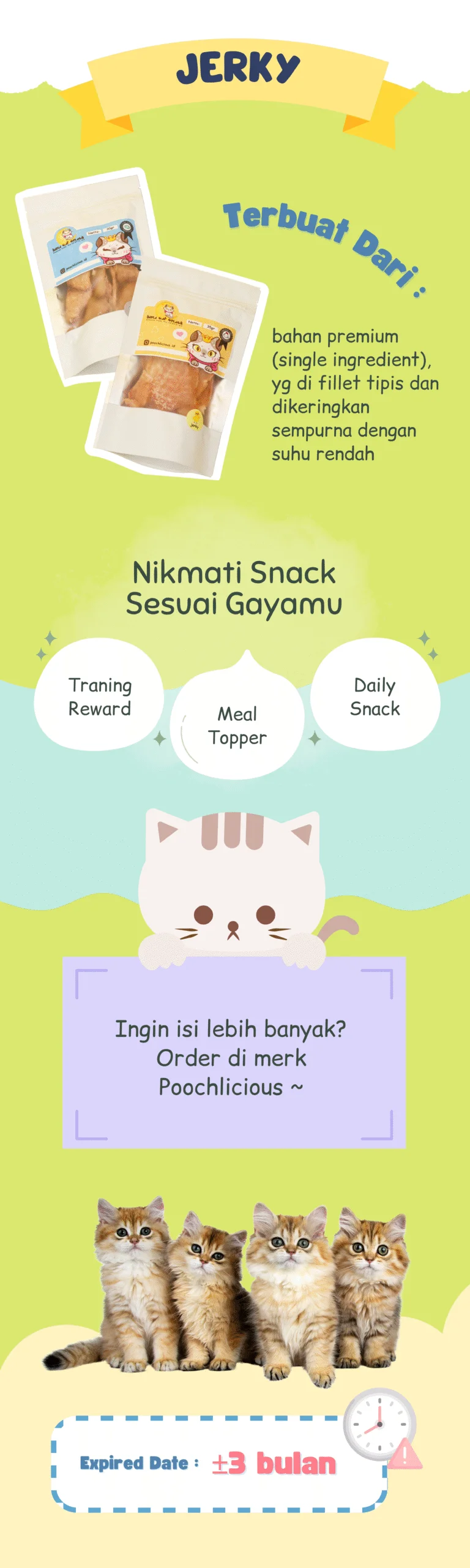 Luna Cat Snack Tuna Jerky adalah camilan sehat untuk kucing yang terbuat dari daging tuna pilihan berkualitas tinggi. Diproses secara higienis tanpa tambahan pengawet dan pewarna buatan, menjadikannya pilihan sempurna untuk memanjakan kucing kesayangan. Teksturnya empuk dan mudah dikunyah, cocok untuk segala usia kucing. Kaya akan protein dan asam lemak omega-3 alami yang mendukung kesehatan bulu, kulit, serta sistem imun kucing.